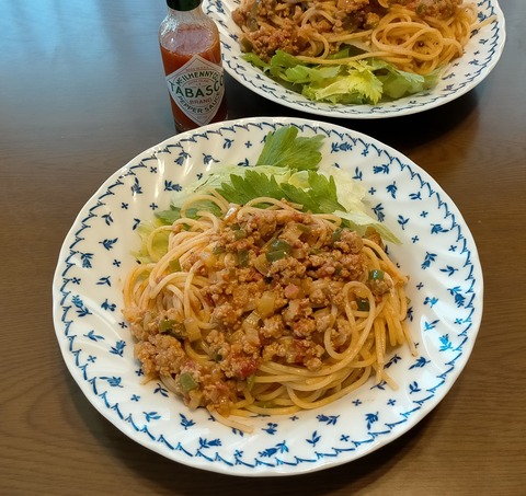 朝体重:46.3kgブランチ:スパゲッティミートソース+レタス・セロリの葉昨日のミートソースに、ピーマン・ブナシメジ・ケチャップ・ウスターソースを···