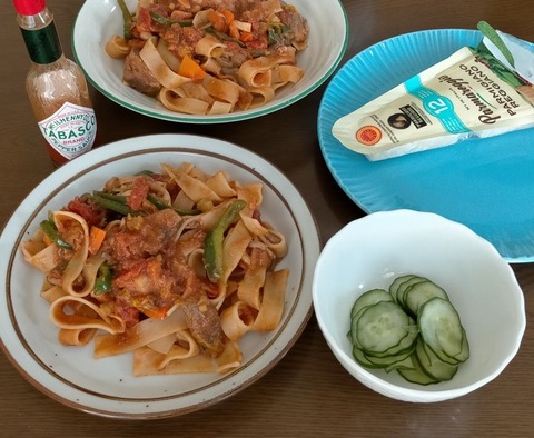 朝体重:45.6kgブランチ:鯖缶タリアテッレ、塩もみキュウリタリアテッレソースに入っているのは、鯖水煮缶・ニンニク・鷹の爪・セロリ・人参・ピーマ···