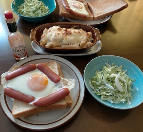 朝体重:45.6kgブランチ:ウインナーエッグトースト、サラダ(キャベツ・セロリの葉・玉ねぎ)、旦那さんだけチキンペンネグラタン所用で午前中でかけ···