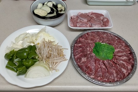 朝体重:44.8kgブランチ:焼肉、焼き野菜肉は米国産牛ハラミ(2割引き)、国産豚カシラ(2割引き)。野菜はキャベツ・もやし・玉ねぎ・ピーマン・茄子···