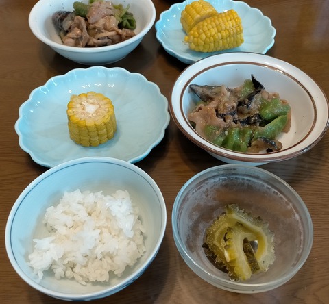 朝体重:46.1kgブランチ:ごはん、ゴーヤピクルス、蒸しトウモロコシ、茄子豚ピーマン味噌炒め茄子がいただき物、交際娯楽費のゴーヤ・トウモロコシ・···