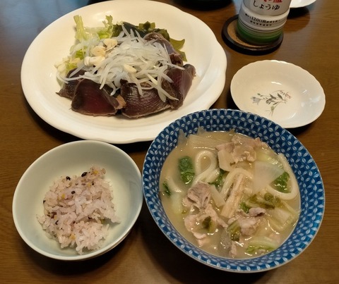 朝体重:45.6kgブランチ:十六穀ご飯、リメイクうどん、カツオのたたきカツオのたたき、光の加減で美味しくなさそうに写ってしまったけれど、普通に美···