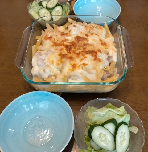 朝体重:45.9kgブランチ:チキンペンネグラタン、レタス・きゅうり牛乳を賞味期限内に飲みきれない時の定番、グラタン。(旦那さんが牛乳不耐っぽくて···