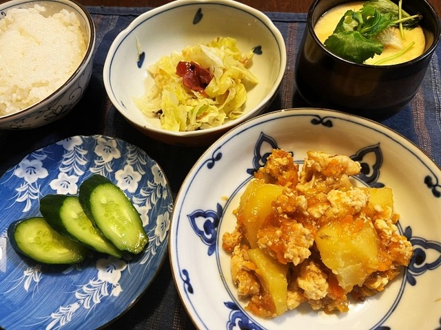 昨日はnanaちゃんが体調不良。熱も有るので消化が良いもの夕食。11月11日の夕食・ジャガイモと鶏そぼろ煮・茶碗蒸し・キャベツの梅和え・ぬか漬け···