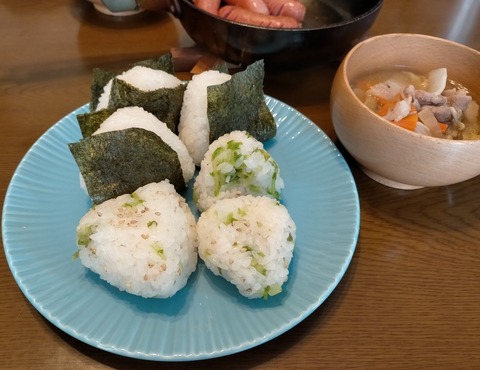 朝体重:45.8kgブランチ:おにぎり(海苔+梅干し・大根葉浅漬け+炒り胡麻)、具沢山汁、ウインナーようやく今年のOnigiriActionに参加できた。(SNS···