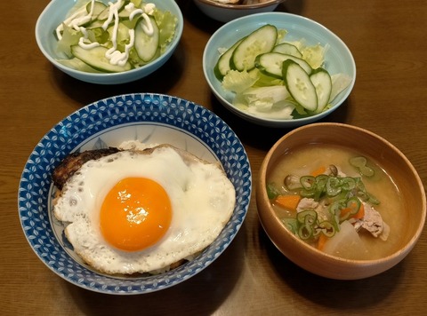 朝体重:45.6kgブランチ:照り焼きハンバーグ玉子丼、豚汁(作り置き最終)、レタス・きゅうり先日作って冷蔵していたハンバーグを照り焼きにして、目···
