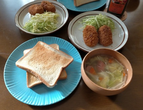 朝体重:46.2kgブランチ:トースト、野菜スープ、カニクリームコロッケ(お惣菜)+キャベツ野菜スープは作り置きにキャベツとエノキを追加して、食べ···