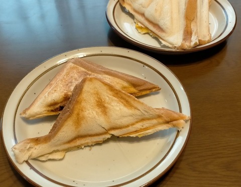 朝体重:45.7kgブランチ:ホットサンド3種中身は、・冷凍していたミートソース+ピザ用溶けるチーズ・ゆで玉子+市販タルタルソース・焼きそば+マヨ···
