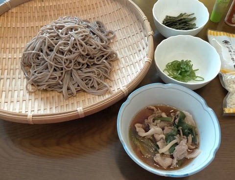 朝体重:45.6kgブランチ:つけそば蕎麦は8月に長野で買ってきたもの。つけ汁に入っているのは、豚肩肉・ネギ・ブナシメジ。薬味はネギ・焼き海苔・天···