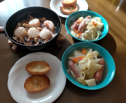 朝体重:46.0kgブランチ:ガーリックトースト、野菜スープ、ホタテとキノコのバター焼き野菜スープに入っているのはウインナー・キャベツ・人参・玉ね···